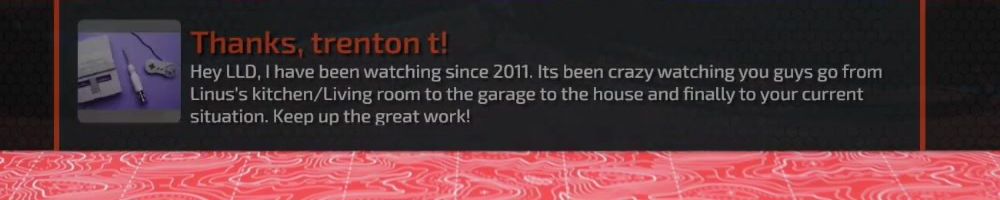 Thanks, trenton t! Hey LLD, I have been watching since 2011. Its been crazy watching you guys go from Linus's kitchen/Living room to the garage to the house and finally to your current situation. Keep up the great work!