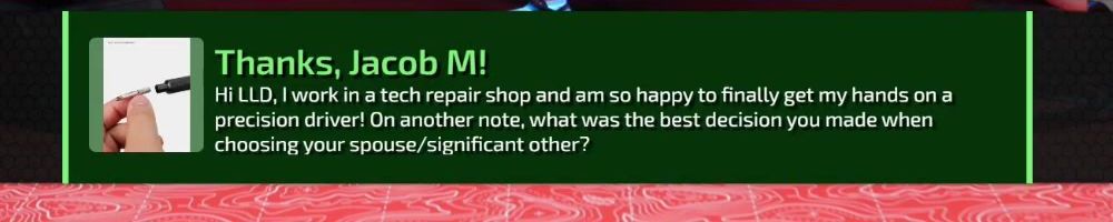 Thanks, Jacob M! Hi LLD, I work in a tech repair shop and am so happy to finally get my hands on a precision driver! On another note, what was the best decision you made when choosing your spouse/significant other?