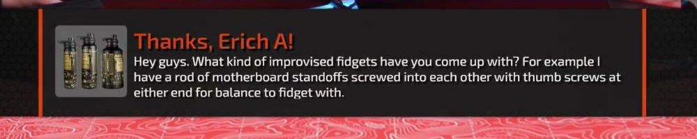 Thanks, Erich A! Hey guys. What kind of improvised fidgets have you come up with? For example I have a rod of motherboard standoffs screwed into each other with thumb screws at either end for balance to fidget with.