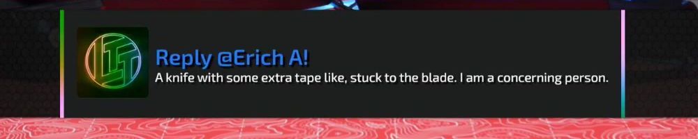 Reply @Erich A! A knife with some extra tape like, stuck to the blade. I am a concerning person.