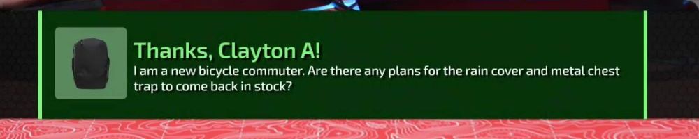 Thanks, Clayton A! I am a new bicycle commuter. Are there any plans for the rain cover and metal chest trap to come back in stock?