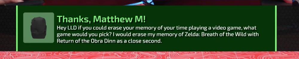 Thanks, Matthew M! Hey LLD if you could erase your memory of your time playing a video game, what game would you pick? I would erase my memory of Zelda: Breath of the Wild with Return of the Obra Dinn as a close second.