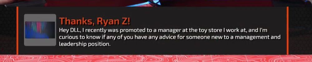 Thanks, Ryan Z! Hey DLL, I recently was promoted to a manager at the toy store I work at, and I'm curious to know if any of you have any advice for someone new to a management and leadership position.