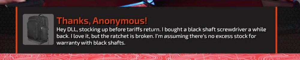 Thanks, Anonymous! Hey DLL, stocking up before tariffs return. I bought a black shaft screwdriver a while back. I love it, but the ratchet is broken. I'm assuming there's no excess stock for warranty with black shafts.