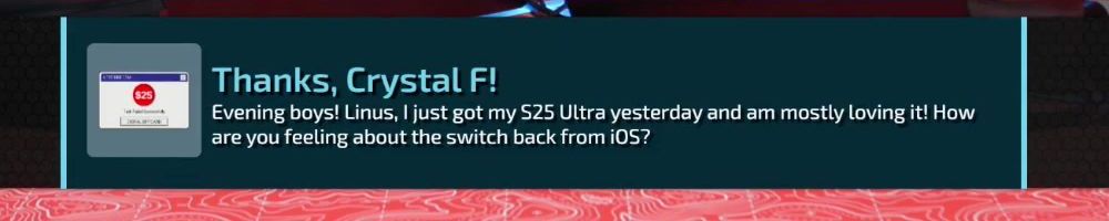 Thanks, Crystal F! Evening boys! Linus, I just got my S25 Ultra yesterday and am mostly loving it! How are you feeling about the switch back from iOS?