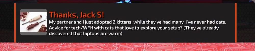 Thanks, Jack S! My partner and I just adopted 2 kittens, while they've had many, I've never had cats. Advice for tech/WFH with cats that love to explore your setup? (They've already discovered that laptops are warm)