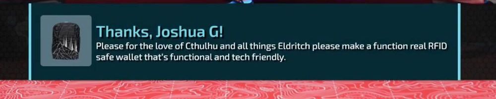 Thanks, Joshua G! Please for the love of Cthulhu and all things Eldritch please make a function real RFID safe wallet that's functional and tech friendly.