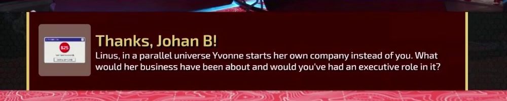 Linus, in a parallel universe Yvonne starts her own company instead of you. What would her business have been about and would you've had an executive role in it?