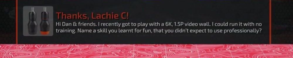 Hi Dan & friends. I recently got to play with a 6K, 1.5P video wall. I could run it with no training. Name a skill you learnt for fun, that you didn't expect to use professionally?