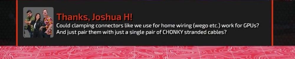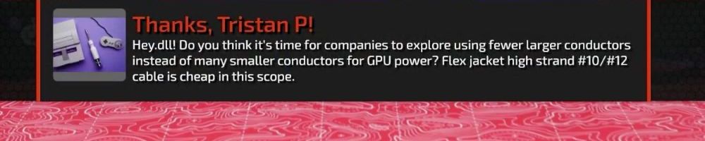 Hey.dll! Do you think it's time for companies to explore using fewer larger conductors instead of many smaller conductors for GPU power? Flex jacket high strand #10/#12 cable is cheap in this scope.