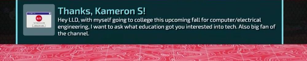 Hey LLD, with myself going to college this upcoming fall for computer/electrical engineering, I want to ask what education got you interested into tech. Also big fan of the channel.