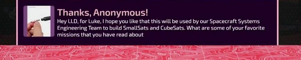 Hey LLD, for Luke, I hope you like that this will be used by our Spacecraft Systems Engineering Team to build SmallSats and CubeSats. What are some of your favorite missions that you have read about