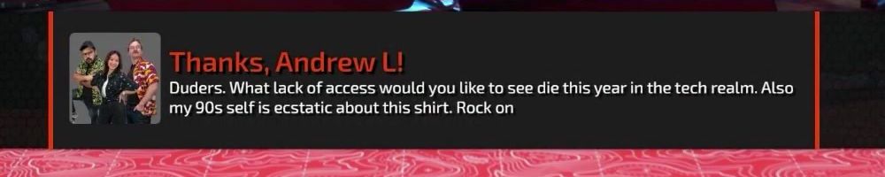 Duders. What lack of access would you like to see die this year in the tech realm. Also my 90s self is ecstatic about this shirt. Rock on