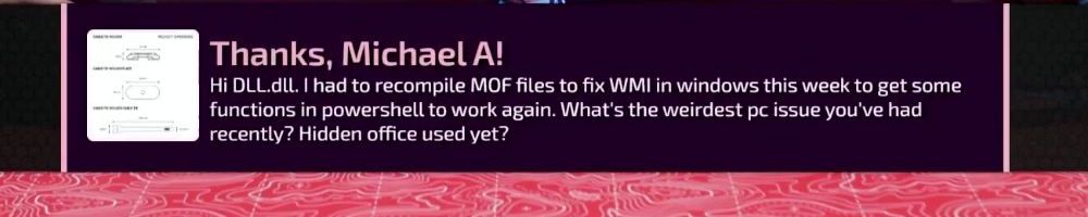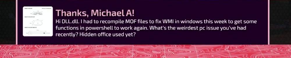 Hi DLL.dIL I had to recompile MOF files to fix WMI in windows this week to get some functions in powershell to work again. What's the weirdest pc issue you've had recently? Hidden office used yet?