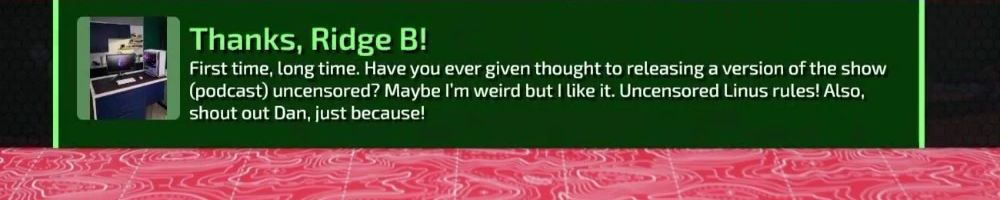First time, long time. Have you ever given thought to releasing a version of the show (podcast) uncensored? Maybe I'm weird but I like it. Uncensored Linus rules! Also, shout out Dan, just because!