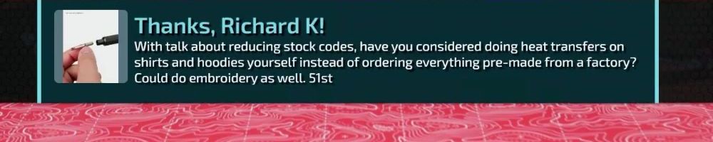 With talk about reducing stock codes, have you considered doing heat transfers on shirts and hoodies yourself instead of ordering everything pre-made from a factory? Could do embroidery as well. 51st