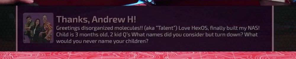 Greetings disorganized molecules!! (aka "Talent") Love HexOS, finally built my NAS! Child is 3 months old, 2 kid Q's What names did you consider but turn down? What would you never name your children?