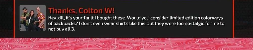 Hey .dll, it's your fault I bought these. Would you consider limited edition colorways of backpacks? I don't even wear shirts like this but they were too nostalgic for me to not buy all 3.