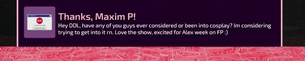 Hey DDL, have any of you guys ever considered or been into cosplay? Im considering trying to get int it rn. Love the show, excited for Alex week on FP :)