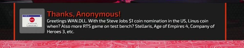 Greetings WAN.DLL. With the Steve Jobs $1 coin nomination in the US, Linus coin when? Also more RTS game on test bench? Stellaris, Age of Empires 4, Company of Heroes 3, etc.