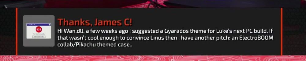 Hi Wan.dll, a few weeks ago I suggested a Gyarados theme for Luke's next PC build. If that wasn't cool enough to convince Linus then I have another pitch: an ElectroBOOM collab/Pikachu themed case.
