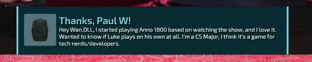 Hey Wan.DLL, I started playing Anno 1800 based on watching the show, and I love it.