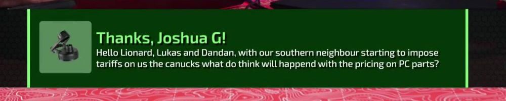 Hello Lionard, Lukas and Dandan, with our southern neighbour starting to impose tariffs on us the canucks what do think will happend with the pricing on PC parts?