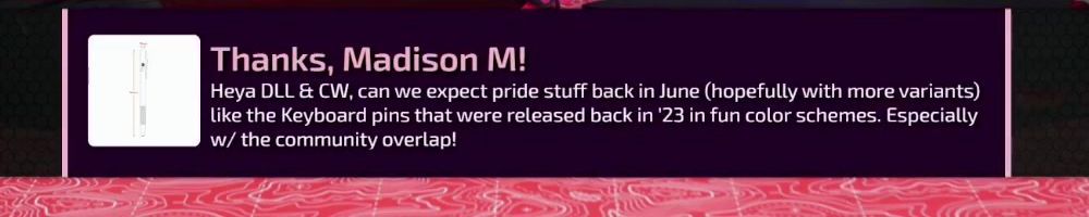 Heya DLL & CW, can we expect pride stuff back in June (hopefully with more variants) like the Keyboard pins that were released back in '23 in fun color schemes. Especially w/ the community overlap!