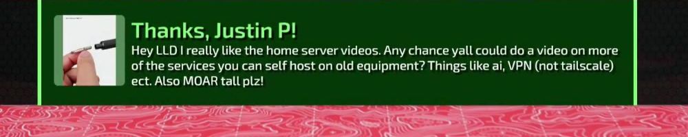 Hey LLD I really like the home server videos. Any chance yall could do a video on more of the services you can self host on old equipment? Things like ai, VPN (not tailscale) ect. Also MOAR tall plz!