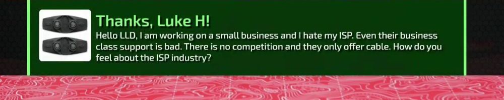 Hello LLD, I am working on a small business and I hate my ISP. Even their business class support is bad. There is no competition and they only offer cable. How do you feel about the ISP industry?