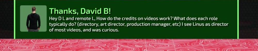 Hey D L and remote L, How do the credits on videos work? What does each role typically do? (directory, art director, production manager, etc) I see Linus as director of most videos, and was curious.