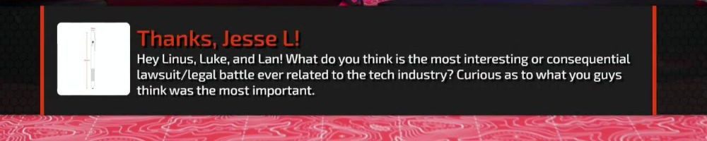 Hey Linus, Luke, and Lan! What do you think is the most interesting or consequential lawsuit/legal battle ever related to the tech industry? Curious as to what you guys think was the most important.
