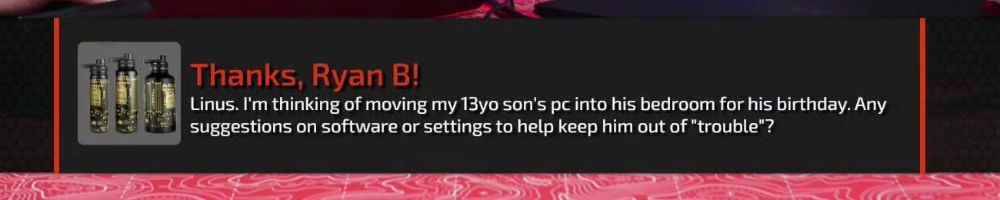 Linus. I'm thinking of moving my 13yo son's pc into his bedroom for his birthday. Any suggestions on software or settings to help keep him out of "trouble"?