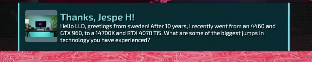 Hello LLD, greetings from sweden! After 10 years, I recently went from an 4460 and GTX 960, to a 14700K and RTX 4070 TiS. What are some of the biggest jumps in technology you have experienced?