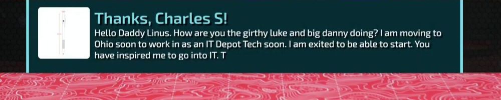 Hello Daddy Linus. How are you the girthy luke and big danny doing? I am moving to Ohio soon to work in as an IT Depot Tech soon. I am excited to be able to start. You have inspired me to go into IT. T