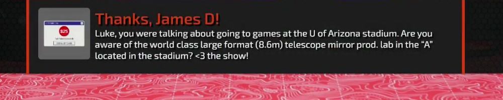 Luke, you were talking about going to games at the U of Arizona stadium. Are you aware of the world class large format (8.6m) telescope mirror prod. lab in the "A" located in the stadium? <3 the show!