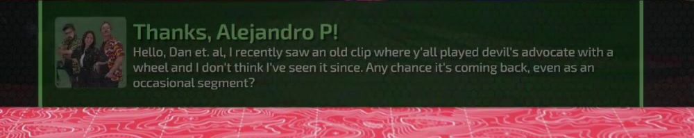 Hello, Dan et. al, I recently saw an old clip where y'all played devil's advocate with a wheel and I don't think I've seen it since. Any chance it's coming back, even as an occasional segment?