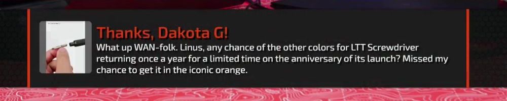 What up WAN-folk. Linus, any chance of the other colors for LTT Screwdriver returning once a year for a limited time on the anniversary of its launch? Missed my chance to get it in the iconic orange.