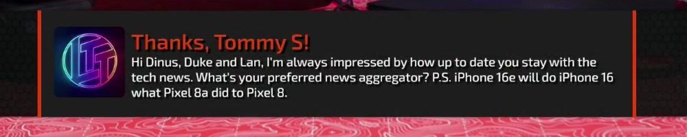 Hi Dinus, Duke and Lan, I'm always impressed by how up to date you stay with the tech news. What's your preferred news aggregator? P.S. iPhone 16e will do iPhone 16 what Pixel 8a did to Pixel 8.
