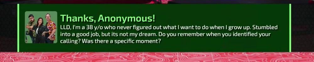 LLD, I'm a 38 y/o who never figured out what I want to do when I grow up. Stumbled into a good job, but it's not my dream. Do you remember when you identified your calling? Was there a specific moment?
