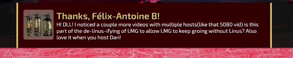 HI DLL! I noticed a couple more videos with multiple hosts(like that 5080 vid) is this part of the de-linus-ifying of LMG to allow LMG to keep groing without Linus? Also love it when you host Dan!