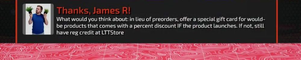 What would you think about: in lieu of preorders, offer a special gift card for would-be products that comes with a percent discount IF the product launches. If not, still have reg credit at LTTStore