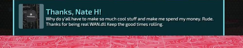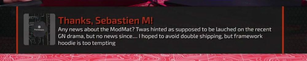 Any news about the ModMat? Twas hinted as supposed to be launched on the recent GN drama, but no news since.... I hoped to avoid double shipping, but framework hoodie is too tempting