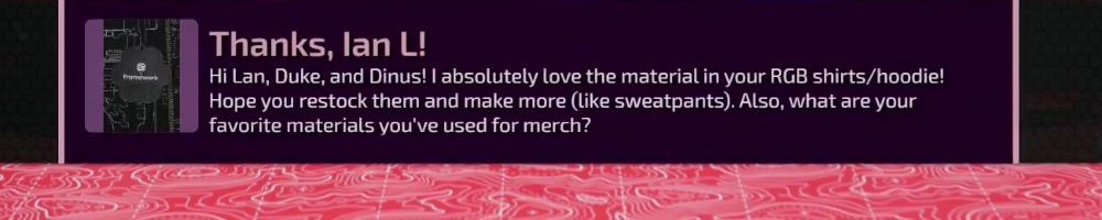 Hi Ian, Duke, and Dinus! I absolutely love the material in your RGB shirts/hoodie!