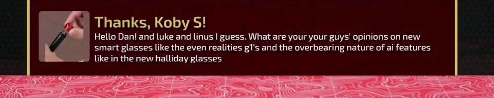 Hello Dan! and Luke and Linus I guess. What are your your guys' opinions on new smart glasses like the even realities g1's and the overbearing nature of ai features like in the new halliday glasses
