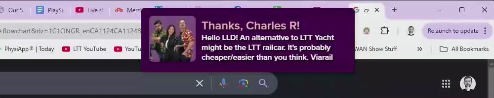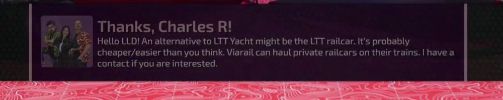 Hello LLD! An alternative to LTT Yacht might be the LTT railcar. It's probably cheaper/easier than you think. Viarail can haul private railcars on their trains. I have a contact if you are interested.