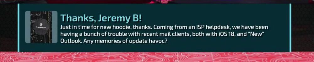 Just in time for new hoodie, thanks. Coming from an ISP helpdesk, we have been having a bunch of trouble with recent mail clients, both with iOS 18, and "New" Outlook. Any memories of update havoc?