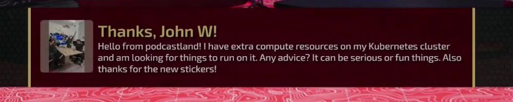 Hello from podcastland! I have extra compute resources on my Kubernetes cluster and am looking for things to run on it. Any advice? It can be serious or fun things. Also thanks for the new stickers!