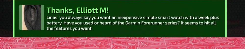 Linas, you always say you want an inexpensive simple smart watch with a week plus battery. Have you used or heard of the Garmin Forerunner series? It seems to hit all the features you want.
