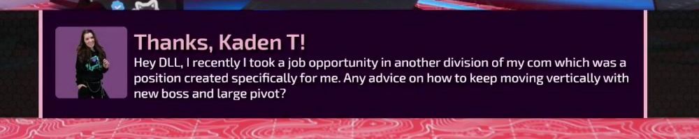 Thanks, Kaden T! Hey DLL, I recently took a job opportunity in another division of my com which was a position created specifically for me. Any advice on how to keep moving vertically with new boss and large pivot?